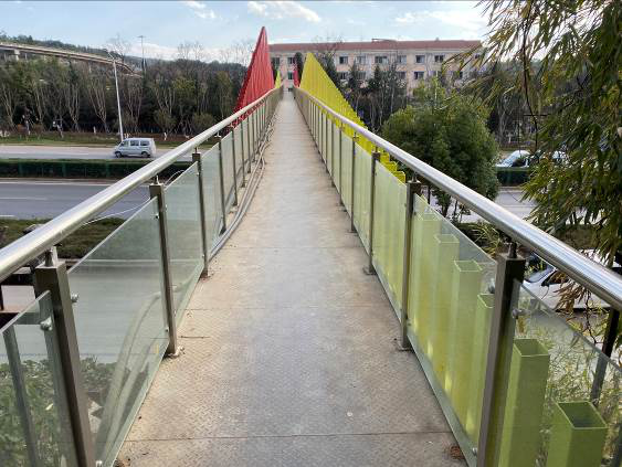 受檢建筑護(hù)欄位于云南省昆明市,該工程主要為綠化景觀提升工程,該工程建設(shè)單位為昆明市城市管理局。結(jié)合委托方提供的圖紙并經(jīng)現(xiàn)場(chǎng)調(diào)查檢測(cè)可知,剪影橋長(zhǎng)約54.00m,寬約4.00m,橋面采用鋼板與主體結(jié)構(gòu)連接,建筑護(hù)欄立柱與鋼板焊接,立柱采用60mm×60mm×3mm不銹鋼管,立柱之間主要間距為1.12m,扶手采用Φ60mm×3mm不銹鋼管,欄板采用12mm厚不同尺寸的兩塊鋼化玻璃組合而成;迎賓橋長(zhǎng)約78.95m,寬約1.50m,橋面采用鋼板與主體結(jié)構(gòu)連接,建筑護(hù)欄立柱與鋼板焊接,立柱采用60mm×60mm×3mm不銹鋼管,立柱之間主要間距為1.11m,扶手采用φ60mm×3mm不銹鋼管,欄板采用12mm厚不同尺寸的鋼化玻璃。