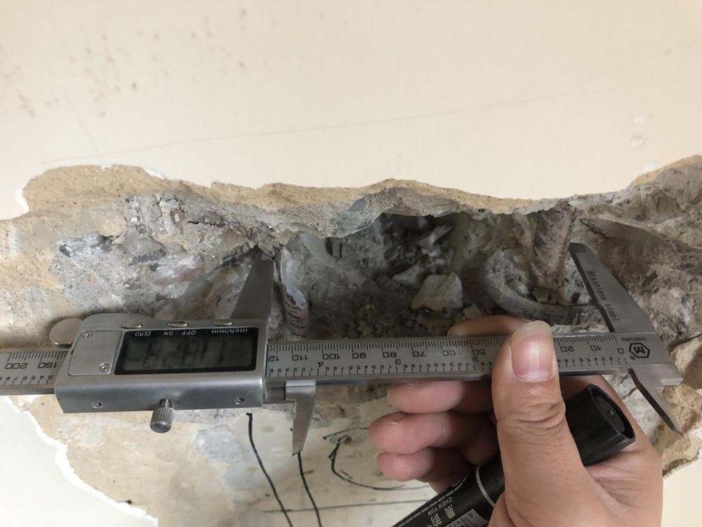 測(cè)定時(shí)把裂縫全長(zhǎng)分為四等分,中央點(diǎn)和兩端,以及中央點(diǎn)和中間的第三分點(diǎn)。測(cè)定裂縫方向上的垂直寬度,使用帶有刻度的專(zhuān)用顯微鏡,將刻度與縫口垂直,量出縫口寬度,記下讀數(shù)并標(biāo)于圖上。也可以采用裂縫卡通過(guò)放大鏡估計(jì)裂縫寬度,但這種方法誤差較大。裂縫長(zhǎng)度可用鋼尺測(cè)量,在裂縫的端部要有標(biāo)志,標(biāo)上年月日,以觀(guān)測(cè)裂縫的發(fā)展。在測(cè)定裂縫長(zhǎng)度和寬度的同時(shí),須同時(shí)確認(rèn)保護(hù)層厚度,保護(hù)層混凝土厚度不宜用鏨鑿開(kāi)時(shí),可用鋼筋探測(cè)器找出其厚度。