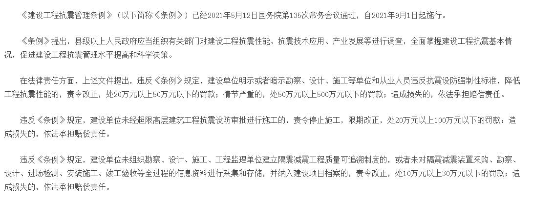 《建設工程抗震管理條例》(以下簡稱《條例》)已經(jīng)2021年5月12日國務院第135次常務會議通過,自2021年9月1日起施行。...